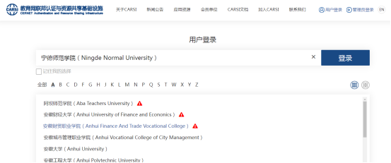 1. 访问CARSI联盟登录网站https://ds.carsi.edu.cn/login/index.html,选择宁德师范学院Ningde Normal University”,点击登录;