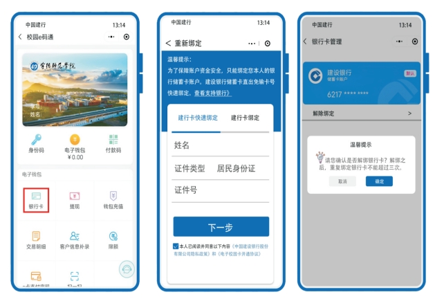 注意:绑定银行卡是用户必须完成的步骤,否则不支持直接使用“电子钱包”、校园卡充值等功能。已绑定建行储蓄卡的学生若需要更改,可点击银行卡管理—解除绑定-然后再重新需要添加的银行卡。(重复绑定银行卡不能超过3次)