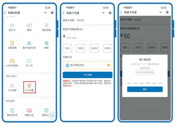 5.绑定银行卡之后,点击“卡片充值”,进入校园卡充值页面。输入需要充值的金额,点击”卡片充值”,进行手机短信验证码验证。验证通过后充值成功。